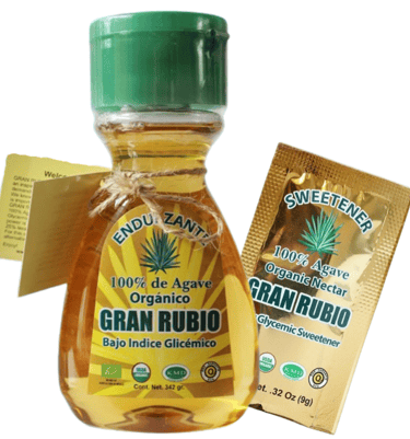 Sirope de agave Gran Rubio también conocido como néctar de agave o miel de agave es el jugo vegetal dulce que se extrae de las hojas o pencas del agave, planta de aspecto parecido a una yuca o cactus pero que en realidad es una suculenta similar al aloe vera.